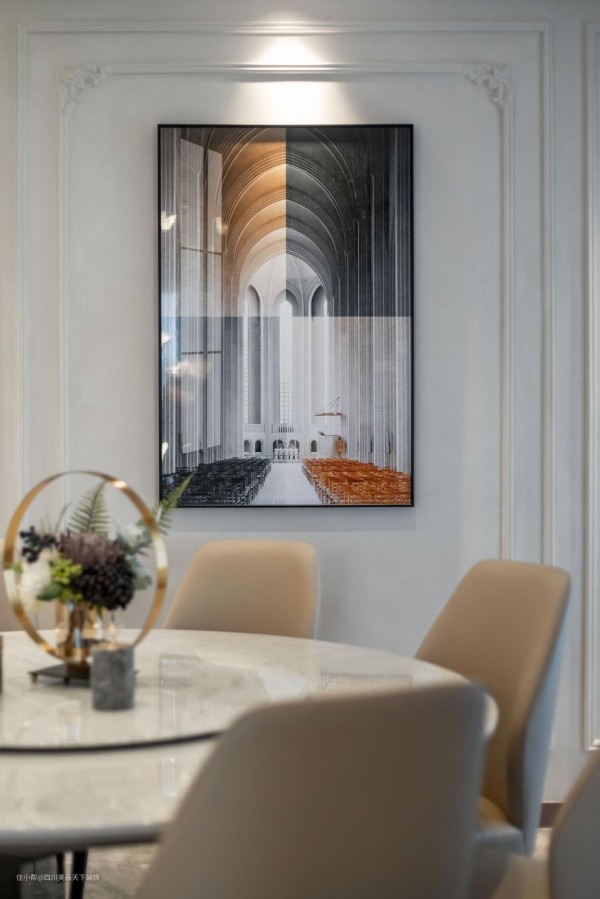 轻奢与现代也很适配,现代轻奢偏快节奏生活的干净利落,高级的中性色护墙板营造空间饱满的质感,金属亮色点缀,整体给人一种大大方方的感觉。