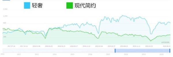 ▲轻奢vs现代简约的热度走势对比,从2018年下半年开始,轻奢就压制现代简约,成为装修界的新宠。