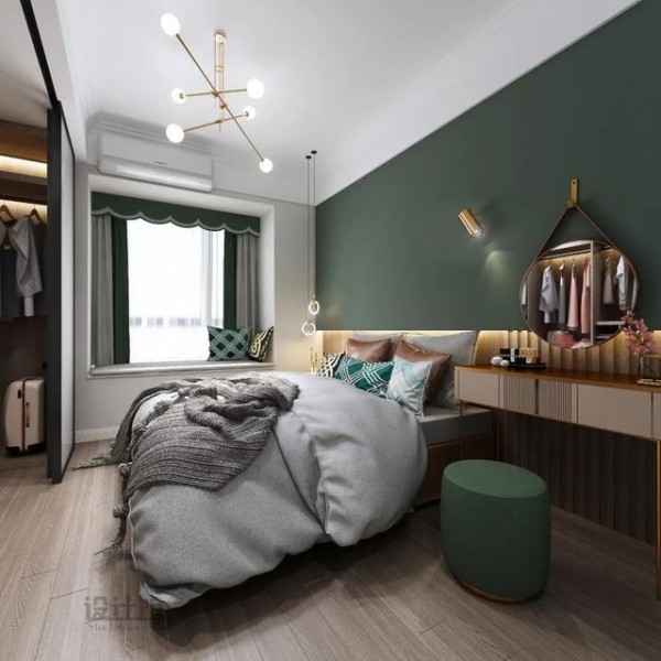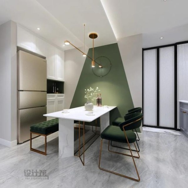 在轻奢风格的空间内,小范围地加入墨蓝色或墨绿色,比如刷在小部分墙面上,又或是选择墨绿色的布艺沙发或椅子灯光,都可以增加空间的成熟与温雅气质,让空间更加稳重档次。