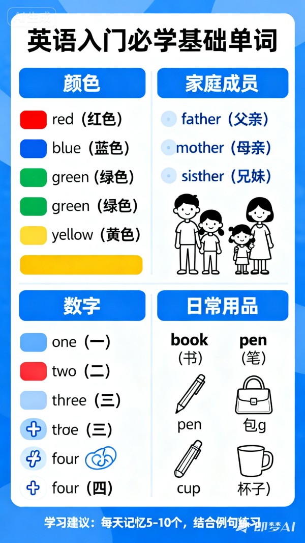 记忆建议结合“单词+实物+例句”,比如看到手机就说“phone - This is my phone” 。如果你需要,我可以帮你整理一份《入门单词每日打卡表》,按“每日12词+2个基础句”规划10天学习计划,需要我制作吗?