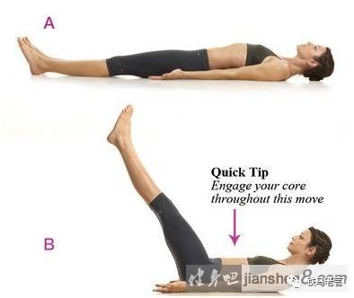 5、收腹举腿。仰卧,上身不动,臀部离地,双腿向上摆起成直角。最好双腿伸直,开始伸不直稍弯曲也可以。