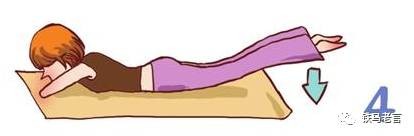 7、俯卧摆腿。俯卧,双手撑在身体两侧,两条腿伸直,向后上方摆起。