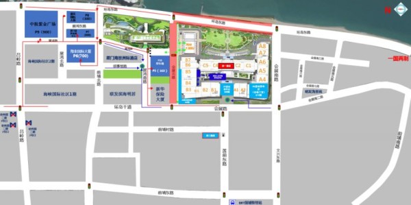 会展中心周边有新华保险大厦、建发国际大厦、翔业国际大厦、中航资金广场等公共停车场,共有2000多个车位,自驾的观众可以通过环岛路、环岛干道、展鸿路到各个停车场停车,步行500余米到海峡大剧院北门检票入场,结束后步行返回停车场驾车驶离。