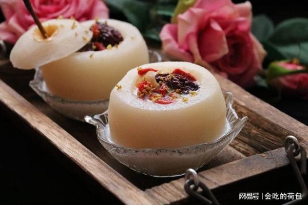 详细做法:梨子洗干净去皮,切下来一小块作为顶盖,用小勺挖掉核儿,放入红枣冰糖进行蒸制,上汽后半小时左右关火。倒入牛奶盖上锅盖焖制5分钟,牛奶变得温热即可食用。