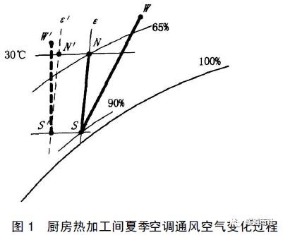 1)由于热加工间排风油烟等污染物量大,不能设置回风或排风热回收装置,补风系统一般为直流新风机组,为了避免能量浪费,室内设计温度取值不宜过低。热加工间的室内设计温、湿度推荐值为30℃,65%,配餐间的室内设计温、湿度推荐值为26℃,65%。气候干热地区室内相对湿度则较低。厨房散热散湿量均较大,热湿比ε假定为8000kJ/kg 。