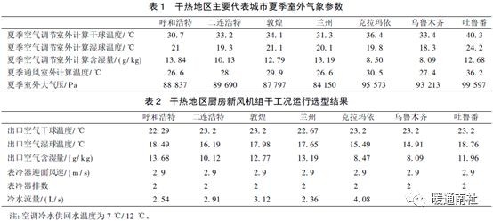 本文中的干热地区是指夏季空调室外计算含湿量小于图1中送风点S含湿量( 16. 12g/kg)的地区。表1为主要代表城市及其夏季室外气象参数。这些地区夏季通风室外计算温度均在26℃以上,但室外含湿量均在14g/kg以下,新风机组需要降温冷却,但不需要除湿,甚至不需要将空气处理至等湿过程的机器露点。某空气处理机组厂家协助笔者进行了表冷器的选择计算,计算结果见表2。从表中可以看出,在正常的迎面风速范围内,表中各城市均能选出合适的表冷器,并且表冷器出口空气温度在22~ 23℃之间,含湿量与室外空气含湿量几乎相同,说明上述干工况处理过程能够实现。