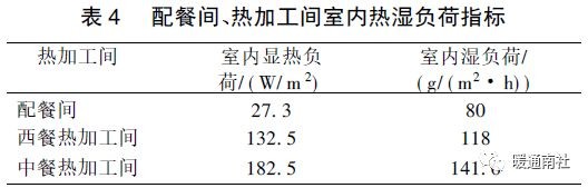 配餐间、热加工间室内热湿负荷指标计算结果如表4 所示。
