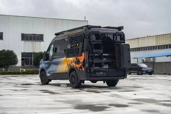 车身尺寸为5500×2050×2480mm(裸车高度),加装行李架后不超过2.6米,轴距3.3米,既满足城市限高要求,又具备出色的通过性。尾部对开门设计配合外置储物舱,可挂装双行李箱,双爬梯结构则兼顾车顶平台使用与行李收纳需求。