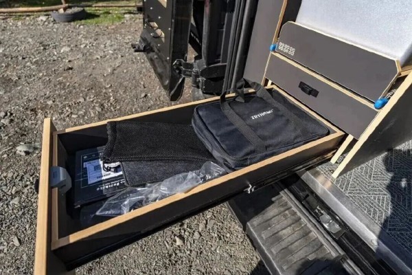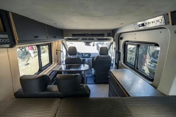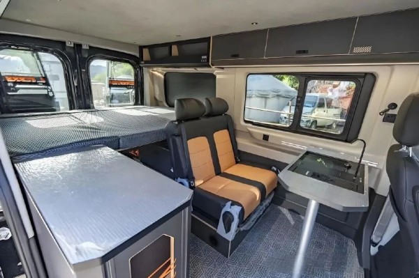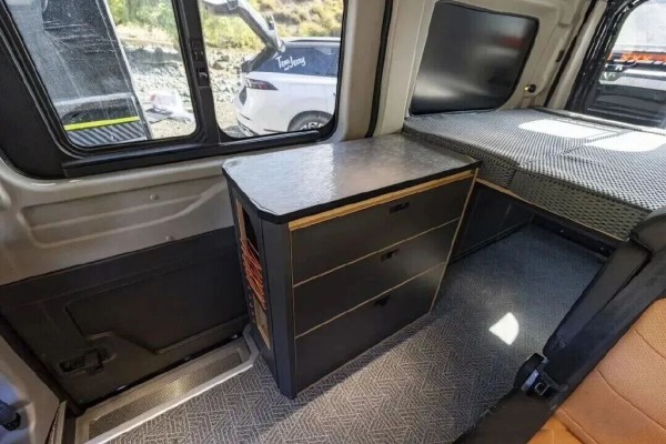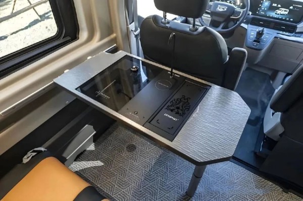 车内采用"暖白光无主灯"设计,搭配E0级环保板材与吸塑开模件,营造温馨无异味的居住环境。内高1.7米虽对高个子用户不够友好,但通过模块化设计最大化利用空间:中置会客区配备IGT模块化桌板,电磁炉、水龙头等设备可自由拆卸,适配车内外多场景使用;侧推窗设计在行车时可随时开启通风,搭配柔和的车内照明,形成通透的视觉效果。储物系统采用"双层收纳"理念,床顶轻量化顶柜与床底空间形成垂直储物区,露营装备、衣物等物品可分类存放。