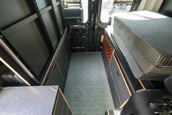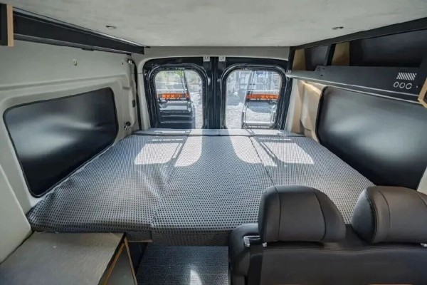车尾横床采用两段式设计,尺寸为2000×1300mm,通过盲窗外拓结构可拓宽至2000×1500mm。床垫采用高密度海绵材质,厚度达10cm,提供良好的支撑性。床下集成3公斤洗烘一体机与储物仓,顶部空调与暖风出口形成均匀温场。床板采用液压支撑结构,抬起后可形成1.2米高的直立空间,下方储物区可容纳自行车等大件装备。尾部玻璃窗配备磁吸式隐私帘,夜间休息时可完全遮挡光线。