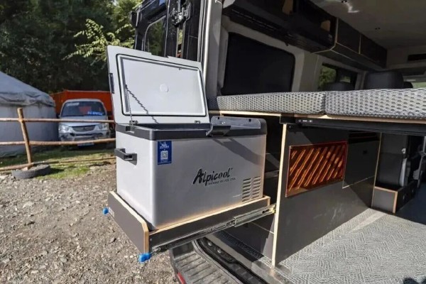 厨房区采用"隐藏式+模块化"设计,操作台面未预设开槽,但三层抽屉提供充足收纳空间。弗罗斯特148L双开门冰箱位于床板下方,支持-18℃至10℃宽温域调节。可选装的户外厨房模组包含便携式卡式炉、折叠水槽与调料架,通过快接接口与车内水路系统连接。特别设计的"盲窗外拓"结构,可在不增加车身宽度的情况下拓展操作空间,满足多人同时烹饪需求。