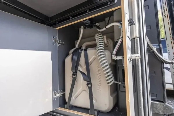 水电系统是G900的核心优势之一。电路系统标配拓宝48V 5度电锂电池组,正式版升级至10度电,支持5kW逆变器与电磁炉、空调等大功率电器长时间运行。车外新能源接口配合48V双发电机,形成"行车充电+驻车补能"的全场景覆盖。水路系统采用20L内置副水箱(防冻设计)+80L底盘主水箱的组合,总储水量达100L,灰水箱70L带自动预警功能。特别设计的快接取水口,可外接淋浴设备或灌溉系统,满足户外用水需求。