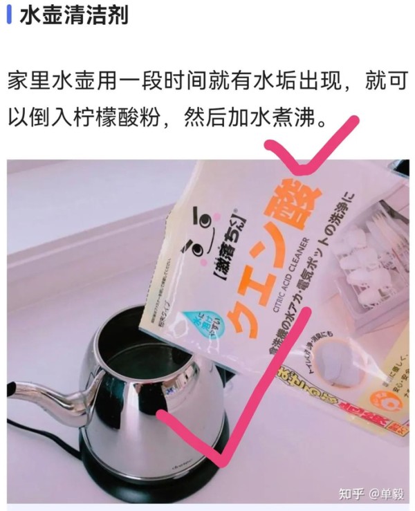 有一种叫做柠檬酸粉的东西,常用来清洗家用水壶中的水垢,百试百灵。