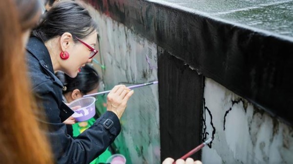 据介绍,本次沙龙打造了多层次、高互动的艺术参与场景,独特的创作形式让市民参与热情高涨。核心环节“墙面追痕”设置在露天阳台内侧,两块布满岁月痕迹的旧广告板与纹理清晰的木板构成创作载体,参与者遵循“左侧彩色、右侧墨色”的创作规则尽情发挥。