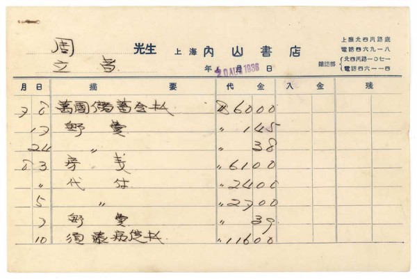 而与鲁迅居住的寓所息息相关的则是位于今四川北路2050号的内山书店。鲁迅定居上海后,与老板内山完造开始交往。内山书店逐渐成为鲁迅购置书籍、收转信件、避难藏身、与人会面的场所,在他的上海岁月中发挥了重要作用。施晓燕表示,鲁迅的住所其实都离内山书店很近,“鲁迅其实有储蓄的习惯,当时书店还替他储蓄,所以鲁迅在上海的生活虽不能算很宽裕,但也不紧张。”展厅中,内山书店的账单纪录了书店为鲁迅代办各类生活事项的账单,有储蓄、邮寄、租房、看病、购书等。