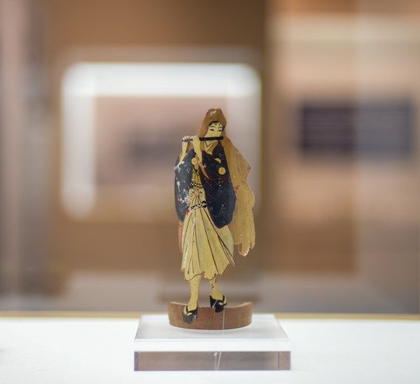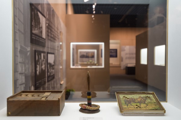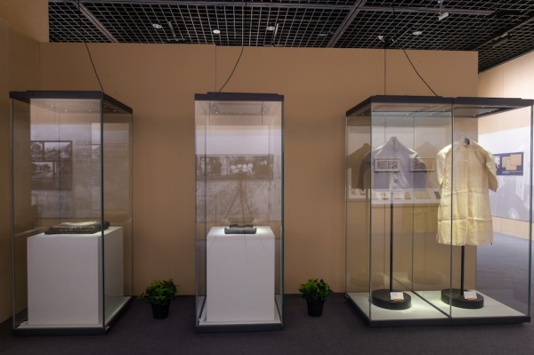 在这一板块的展柜中,亦可看到一些摆件。如鲁迅收集的日本平安时代的传奇英雄牛若丸的人偶。其主体为半片竹,正面镂雕并彩绘牛若丸像,背面有鲁迅题字:“牛若丸 日本别府温泉场所出 一九三〇年十月十一日得于上海 鲁迅记”。而鲁迅教许广平学习时用到的书籍,以及周海婴儿时的玩具也有展出。