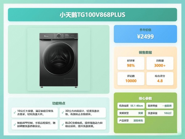小天鹅TG100V868PLUS洗衣机容量不小,10公斤的大容量,能够一次搞定一家人的衣物,像床单、窗帘这些大件也能轻松洗。而且它带有智能投放功能,能够根据衣物重量和水量自动调整洗涤剂的用量,省心不少,也不用担心洗涤剂放多了有残留。