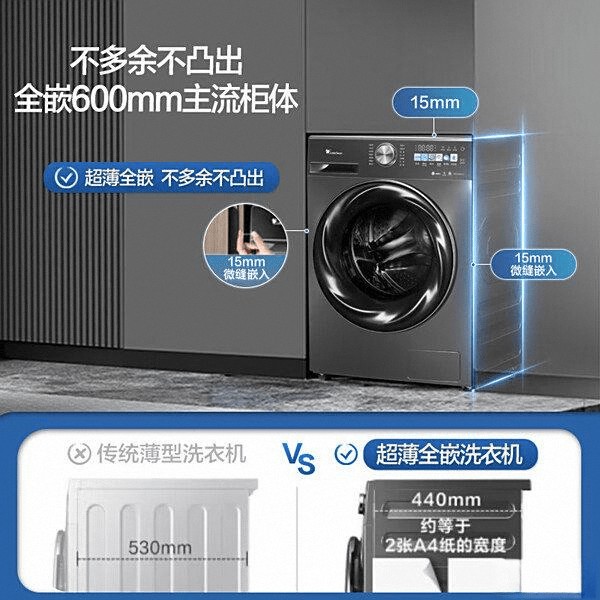 小天鹅TG100RVIC洗衣机的535mm超大筒径设计非常贴心,能够让衣物充分舒展,洗涤更透彻,再也不用担心大件衣物洗不开了!而且它的超薄全嵌设计,能够完美嵌入600mm的柜体,对于寸土寸金的家来说,简直太棒了!