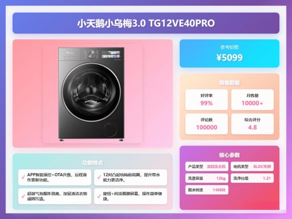 其次,洗衣容量也很重要。一般家庭10公斤的容量就足够用了,但如果经常洗大件,比如被套、窗帘等,那就考虑12公斤的型号,比如小乌梅3.0 TG12VE10PRO,一次性搞定所有衣物,省时省力。