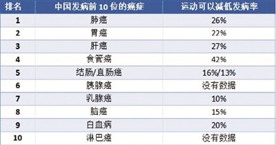 国际权威医学杂志《美国医学杂志·内科》2016年5月发表了美国国家癌症中心的一项研究,该研究对144万人群进行了跨越18年的跟踪研究。结果表明锻炼能显著降低13种癌症的发病率,分别为食管癌(42%),肝癌(27%)、肺癌(26%)、肾癌(23%)、胃癌(22%)、子宫内膜癌(21%)、白血病(20%)、骨髓瘤(17%)、结肠癌(16%)、脑癌(15%)、直肠癌(13%)、膀胱癌(13%)、乳腺癌(10%)。也就是说,中国发病排在前10位的癌症,有8种都可以通过运动获得显著益处。
