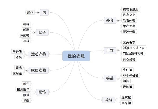 第一个面临的问题,是对服装的分类。没有分类,就谈不上管理。从顺应日常使用习惯的角度出发,我先分了9个大类,分别是: