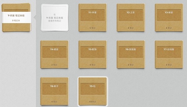 STEP1:按照大类,每个大类对应建立一个笔记本,分别命名为:Y1-外套、Y2-上衣……Y9-包。