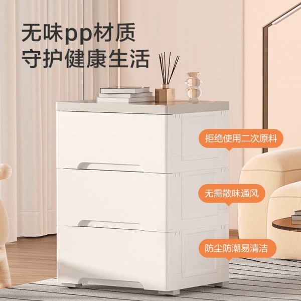 这款床头柜收纳柜采用塑料材质,经过加厚处理,更加坚固耐用,能够承载一定的重量,满足日常储物需求。其三层设计使得收纳空间得以大化利用,无论是书籍、闹钟、眼镜,还是其他小物件,都能轻松找到它们的归属地。