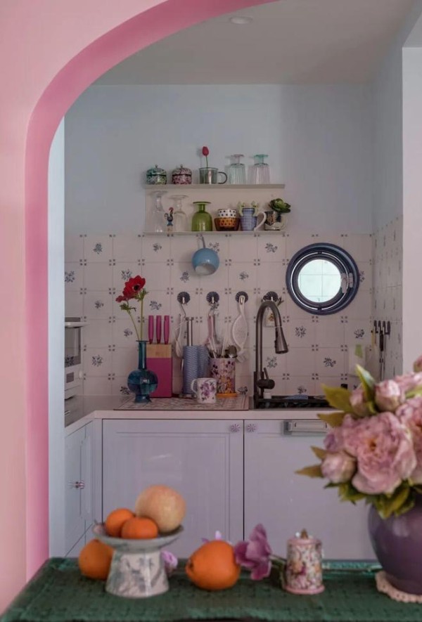 2、细节巧思:将原来的生活阳台改造成三分离卫浴并改善采光,厨房用复古瓷砖 + 精致摆件强化极繁氛围,使每个功能区既有 “性格” 又兼顾实用性。