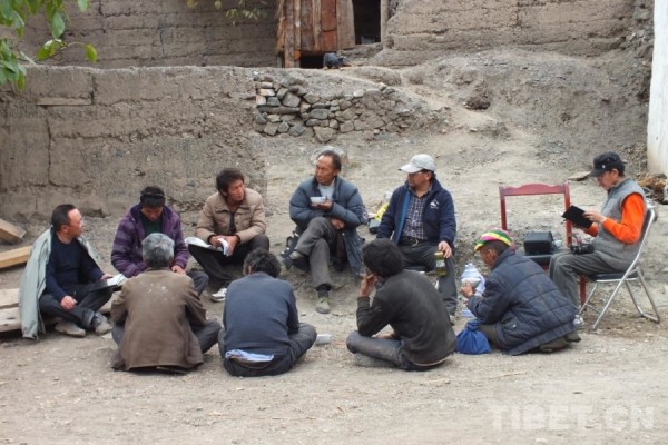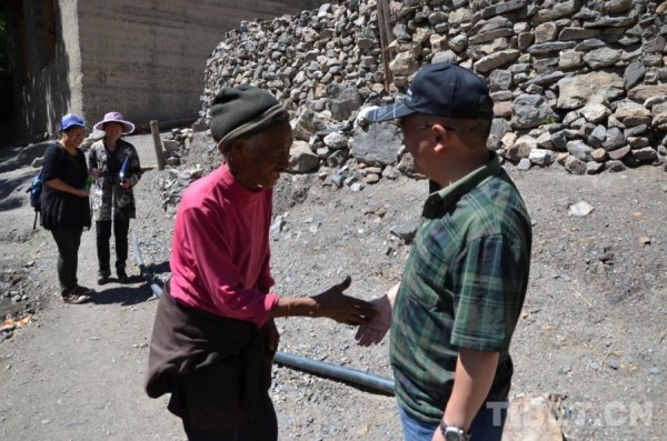 图为在昌都市叶巴村驻村期间,吉米平阶(左一)正在调研