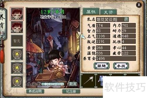 10、 八岁时,仍延续七岁的培养方式,但需注意体力消耗的管理。当疲劳值累积至300以上时,应前往野外生活以降低疲劳;一旦疲劳回落至300以下,则恢复做家务。家务不仅能积累养育金,还能提升叛逆值。当养育金达到120时,便可开始学习诗文。若在做家务过程中,叛逆值接近或达到1200,系统会发出警告提示,表明继续做家务可能导致叛逆超标。此时应立即停止家务,转而学习诗文。若长时间未收到此类提示,说明叛逆尚未接近上限,可继续做家务直至其接近1200再转入诗文学习。倘若养育金不足以支付诗文学习费用,则应前往野外生活,通过打零工等方式积攒资金,直至八岁结束。