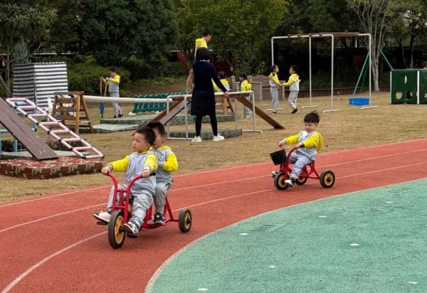 初入中福会新城幼儿园,操场上阳光正好,充满欢声笑语。在老师们的陪伴守护下,孩子们身着明黄色的园服,在各个区域里自在探索:小班的孩子们手持特制球拍进行攻守游戏,中班的孩子们则在沙水区通力合作,搭建、运输“忙”得不亦乐乎。