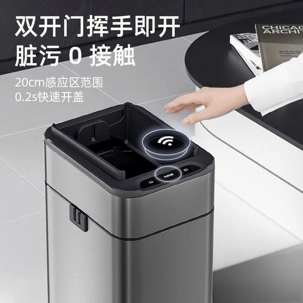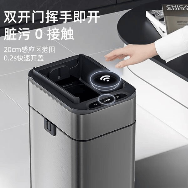 这款苏泊尔智能感应垃圾桶采用高敏感感应技术,只需靠近感应区域,约0.2秒就能自动开启盖子,无需用手触碰,使用起来挺方便又卫生。它的双开门设计让打开更顺畅,还能避免碰到手,特别适合空间有限的厨房或卧室。微晶面板的光滑质感不仅好看,还方便清洁,日常打理挺轻松。