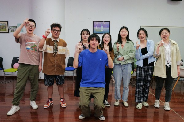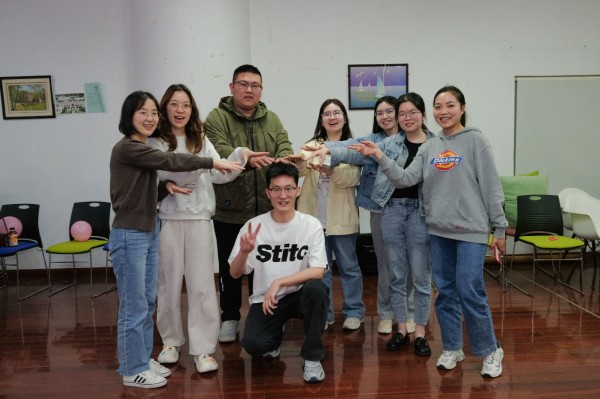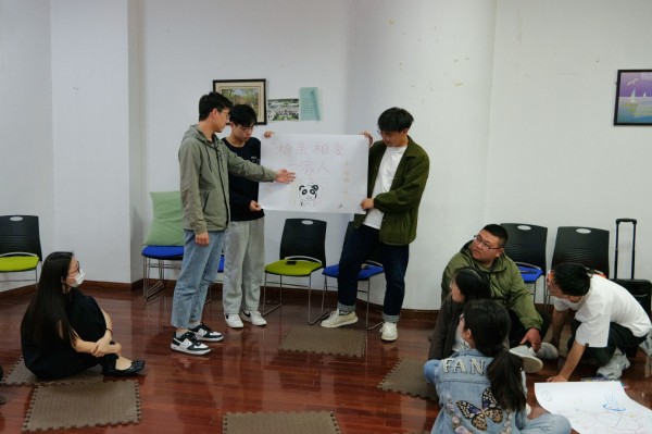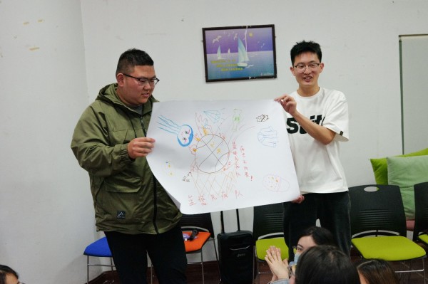 活动主要围绕破冰与热身、团队沟通合作、压力排解释放三个环节展开。活动开始,全体同学在曹老师的带领下进行了“你的名字”、“进化五部曲”破冰小游戏,营造了轻松欢快的团体氛围。紧接着大家通过随机结合分成三个小组,各组成员进行“大纸共同画”,大家群策群力,一起完成本组的作品设计,小组成员之间由开始的陌生、紧张转变为逐渐熟悉并接纳彼此。