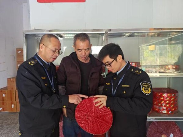 1月10日,融安县市场监督管理局执法人员对大良镇辖区内的烟花爆竹经营户开展烟花爆竹安全检查。(县市场监管局供图)