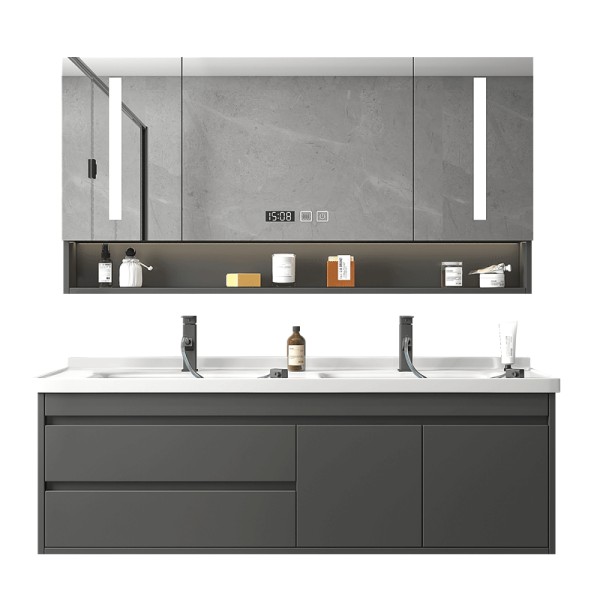 这款洗漱台组合的最大亮点在于它的智能镜柜设计。引入现代科技元素后,洗漱体验变得更加智能与未来感。无论是清晨的匆忙,还是夜晚的放松,智能镜柜都能为您提供便利,让每一次的洗漱都充满科技感。