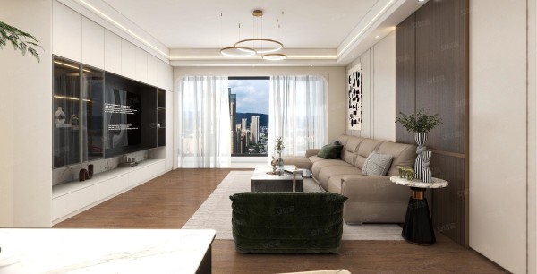 客厅 客厅展现出简约时尚的现代风格。大面积落地窗搭配轻薄纱帘,引入充足采光与城市景观,视野开阔。电视墙以白色为主,嵌入黑色柜体,兼具收纳与展示功能。浅咖色沙发搭配多彩抱枕,舒适又具设计感。金属元素的吊灯、精致摆件,增添空间精致度,整体营造出温馨且富有格调的居住氛围。