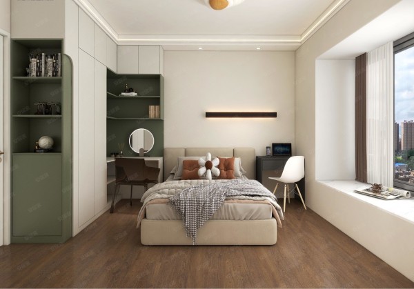 卧室 主卧以简约现代风为主调,营造出舒适惬意的休憩空间。浅米色的床搭配暖棕与灰白配色的床品,温馨又不失时尚感。床头线性壁灯,柔和照亮空间。一侧绿白配色的收纳柜与书桌组合,既满足收纳需求,又提供了学习工作区域。窗边采光极佳,飘窗上放置书籍、摆件,闲暇时可在此观景放松,整体氛围宁静又温馨。