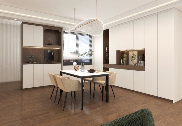 其他 餐厅呈现出简约而精致的现代风格。白色与木色搭配的餐边柜,收纳与展示功能兼具,咖啡机等设备嵌入其中,实用又美观。简洁的方形餐桌搭配同色系座椅,线条利落。独特造型的吊灯,为空间增添艺术氛围。窗边绿植点缀,让用餐环境多了几分自然生机,整体营造出舒适且具格调的用餐氛围。