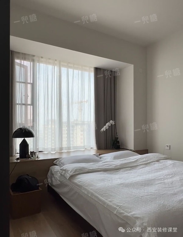 当然也可以直接不要床头,床挨着飘窗布局,布帘在飘窗上,晚上拉上完全满足安全感;同时飘窗木质台面,放上台灯,同时台面兼顾了床头柜的功能