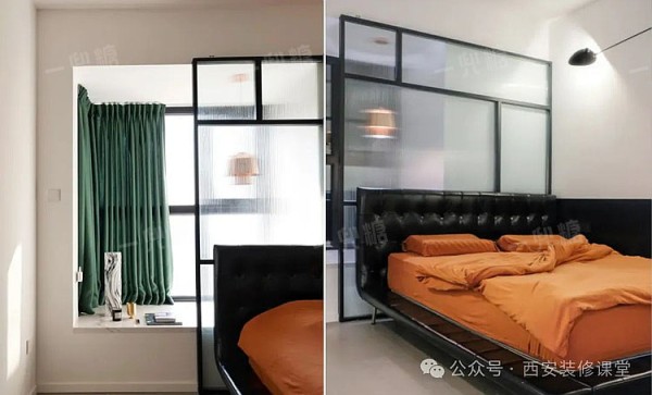 为了空间最大化床头靠飘窗布局,采用长虹玻璃屏风遮挡一下,然后背后飘窗实现一个独立的读书角,而且不受任何人打扰,非常有安全感