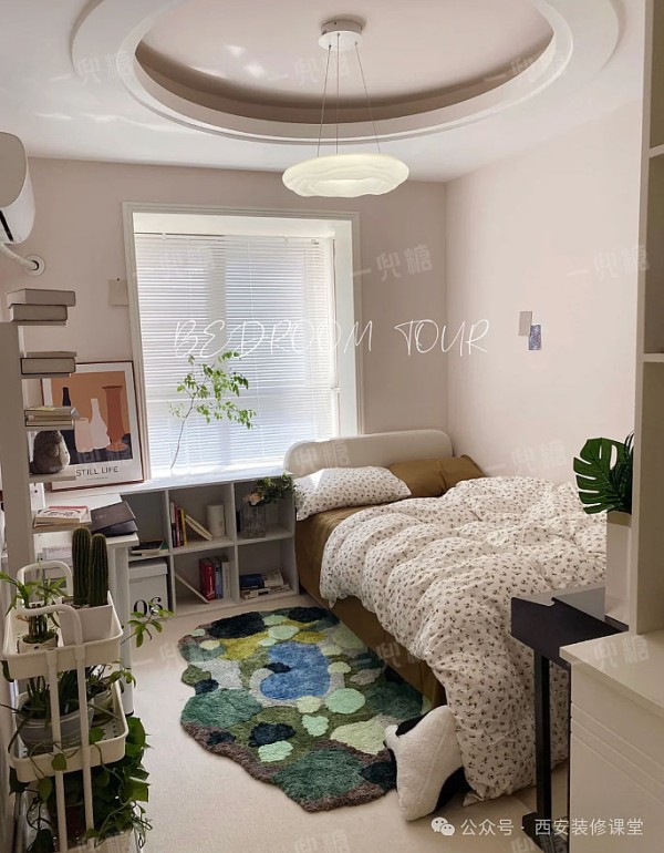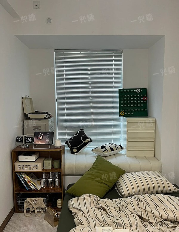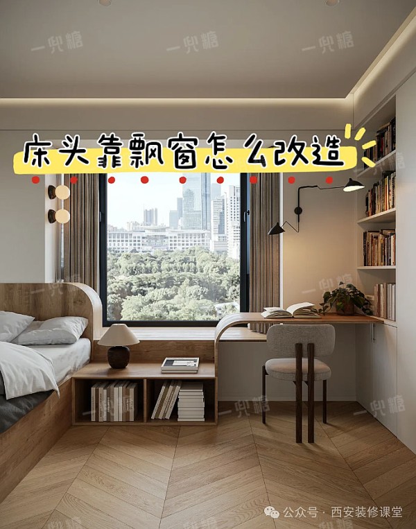 床头靠飘窗,角落书桌书柜布局,空间最大化,提升小空间的价值