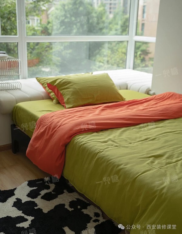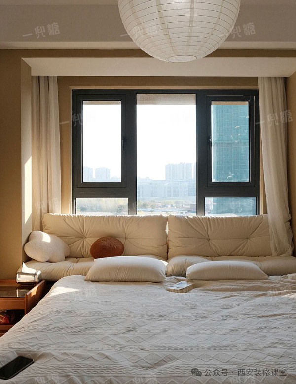 床头直接靠飘窗,飘窗放上沙发垫,包围式床头更有安全感