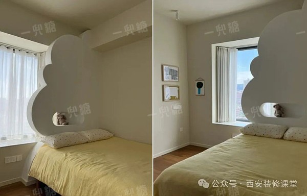 儿童房床头靠飘窗,做一个卡通造型进行遮挡,满足孩子睡眠的安全感,同时让空间发挥最大化价值