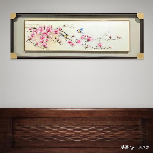 这幅手工刺绣卧室床头画,将玉兰与报喜鸟巧妙结合。画面一株粉玉兰斜枝而生,朵朵花瓣初绽的胭脂粉,过渡的珍珠白,边缘晕着浅绯,彰显出玉兰的通透感,恰似美人颊边的胭脂流转。玉兰又称"望春",象征生机勃发,鸟雀成双寓意“双喜”,二者共同组成了“玉堂富贵”“喜上枝头”等吉祥寓意,其诗情的画面感能与卧室形成温馨的氛围,特别适合新婚夫妇或追求生活情趣的寝居空间。