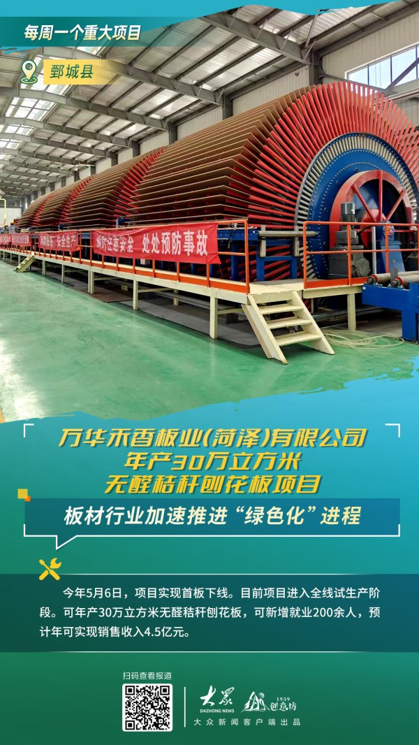 万华禾香板业(菏泽)有限公司年产30万立方米无醛秸秆刨花板项目是2024年山东省重大实施类项目之一,由万华禾香板业有限公司投资建设,是万华生态新家装的产业链配套延伸项目。项目总投资7.19亿元,于2023年5月动工,历经一年的时间,在今年5月6日实现首板下线。