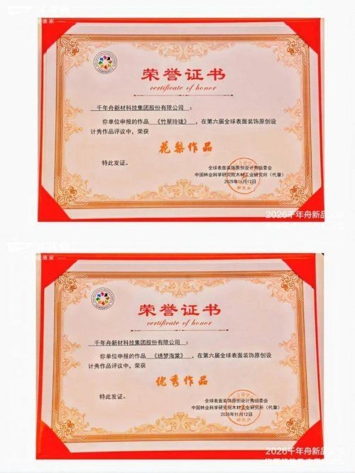 第六届全球表面装饰原创设计秀、原创设计创意分享会率先点燃热潮。千年舟集团凭借对市场趋势的精准把握与原创设计的深厚积淀,“竹翠玲珑”、“绣梦海棠”花色在众多参赛作品中脱颖而出,成功斩获荣誉。