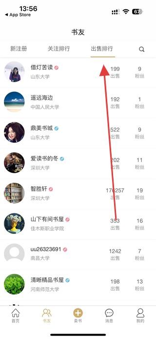 1、进入旧书街APP页面可看到各类书籍展示,点击书友选项,进入书友页面,查看新注册、关注排行、出售排行等书友信息。