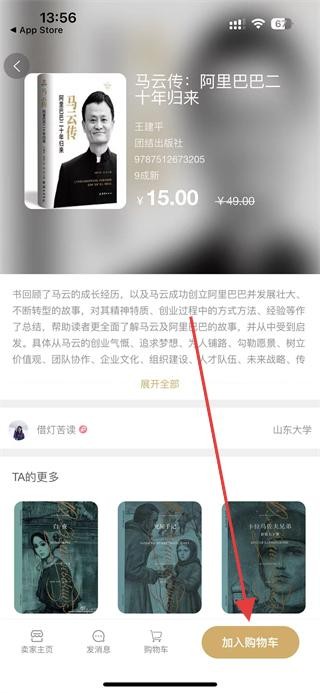 4、在书籍详情页面,点击加入购物车按钮,将书籍加入购物车,以便后续购买,也可与书友发消息交流,了解书籍更多情况。