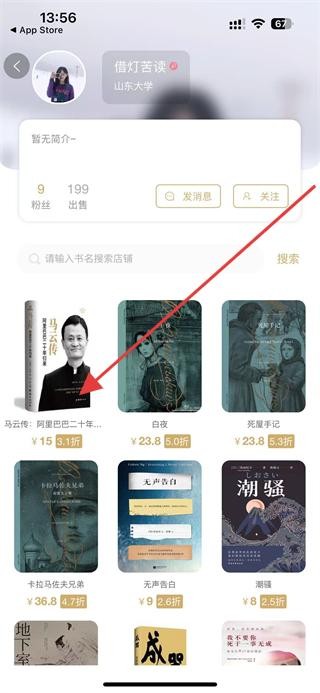 2、在书友页面选择借灯苦读等书友,点击进入其个人页面,查看其出售的书籍,如马云传、白夜等。