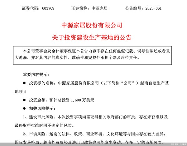 北京商报记者通过公告了解到,为应对外部环境不确定性,增强公司供应链的韧性和安全水平,满足公司业务拓展需求,中源家居拟出资1600万美元投资建设越南自建生产基地项目。上述投资总额将用于中源家居越南自建生产基地项目产能建设、业务发展所必须的生产经营活动,包括但不限于购置土地、建造厂房及附属设施、购置机器设备等。